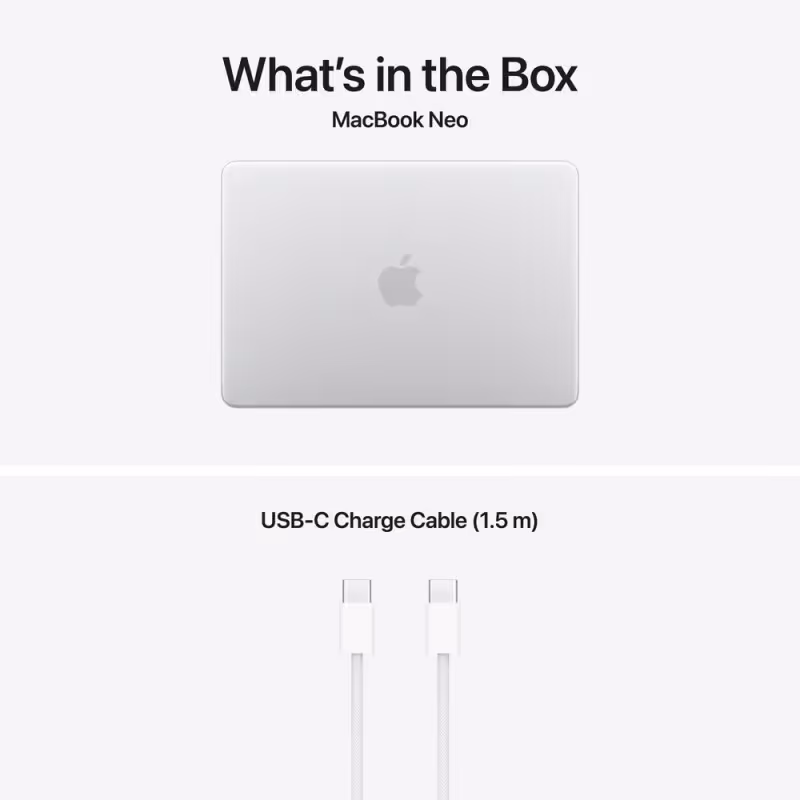 Modèle : Apple MacBook Neo A18 Pro Référence : MHFC4FN-A Écran : 13" Liquid Retina LED IPS – 2408 x 1506 pixels Processeur : Apple A18 Pro Architecture CPU : 6 cœurs (2 performance + 4 efficacité énergétique) GPU : 5 cœurs NPU : Apple Neural Engine Système d’exploitation : macOS Mémoire RAM : 8 Go Stockage : 512 Go SSD Connectivité : Wi-Fi 6E, Bluetooth Multimédia : Webcam, Microphone intégré, Haut-parleurs intégrés Clavier : Magic Keyboard avec Touch ID Autonomie : Jusqu’à 16 heures Batterie : 36.5 Wh Ports : 2x USB-C, Prise casque 3.5 mm Couleur : Silver Garantie : 1 an Adaptateur : Non inclus