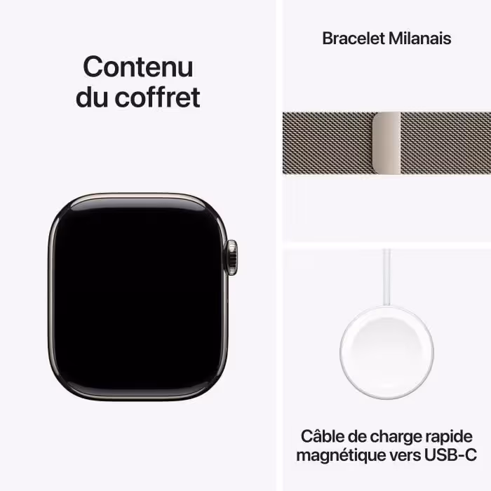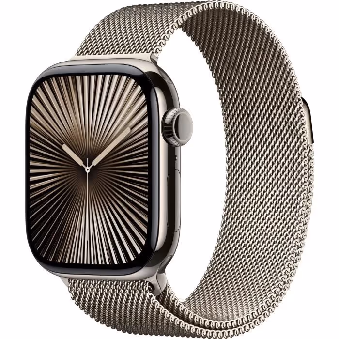 Apple Watch Series 10 GPS + Cellular – 42 mm titane naturel avec bracelet Milanese Loop. Écran Retina OLED 1,9", puce S10, capteurs santé, et autonomie 18 h. chez Techland Tunisie.