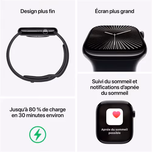 Propulsée par la puce S10, l’Apple Watch Series 10 garantit des performances rapides et fluides, que ce soit pour naviguer dans les menus, suivre vos activités ou gérer vos notifications.