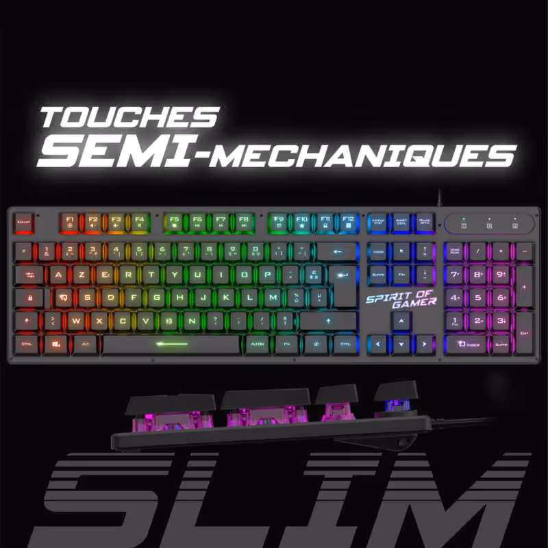 Clavier Gamer Filaire Spirit of Gamer CLA-PK1FR - Membrane Semi Mécanique - Rétroéclairage RGB 3 modes - 26 Touches Anti-Ghosting - Pavé numérique - 105 Touches - Hauteur réglable - Connexion Filaire USB - Longueur du câble: 1.50 m - Dimensions: 43.8 x 12.9 x 2.9 cm - Poids: 438 g - Couleur Noir - Garantie 1 an