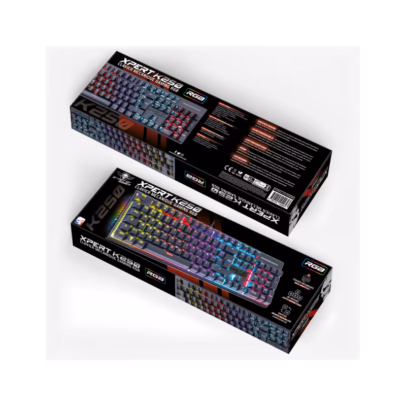 Clavier Gamer SPIRIT OF GAMER XPERT-K250 - Technologie de Connectivité Double Mode: Filaire - Interface avec l'ordinateur: USB - Type de Clavier: Mécanique Switch Rouge - Norme de clavier: AZERTY - Nombre de touches: 105 touches - Antighosting Technologie Rollover 26 touches - Rétro-éclairage RGB - Hauteur réglable en 2 positions - Longueur du câble: 1,5 métre - Dimensions: 43.4 x 12.8 x 3.2 cm - Poids: 650g - Couleur: Noir