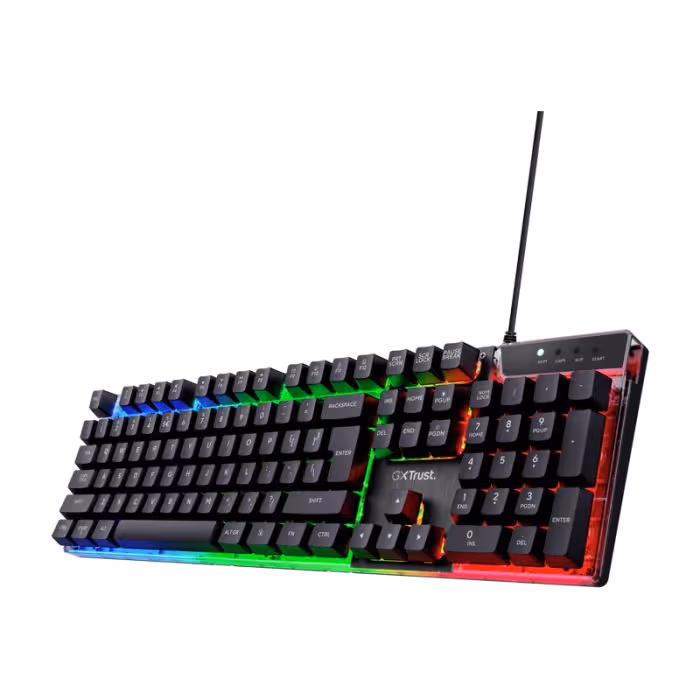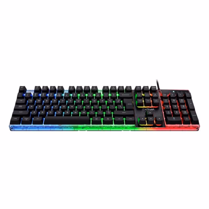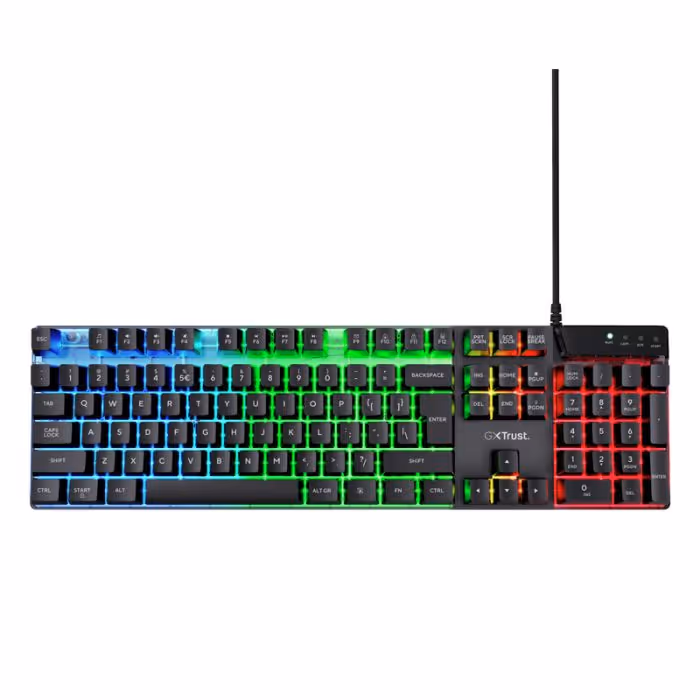 Le Clavier Gamer Filaire Trust Azor GXT 835 - Noir est conçu pour offrir aux joueurs une expérience de jeu fluide et réactive. Son design ergonomique et son rétroéclairage arc-en-ciel en vagues apportent une ambiance visuelle dynamique à vos sessions de jeu.