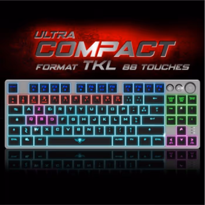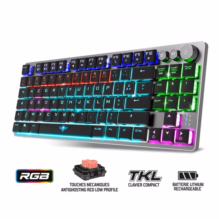 Le Clavier Gamer Sans Fil Spirit Of Gamer XK1300RF RGB se démarque par son format 65 % ultra-compact (88 touches), tout en conservant les fonctions essentielles pour le gaming. Équipé de commutateurs mécaniques rouges profil bas, il assure une frappe fluide, linéaire et silencieuse, idéale pour les longues sessions de jeu comme pour la bureautique. Sa technologie anti-ghosting complète garantit une parfaite reconnaissance des touches, même en cas de frappes simultanées.