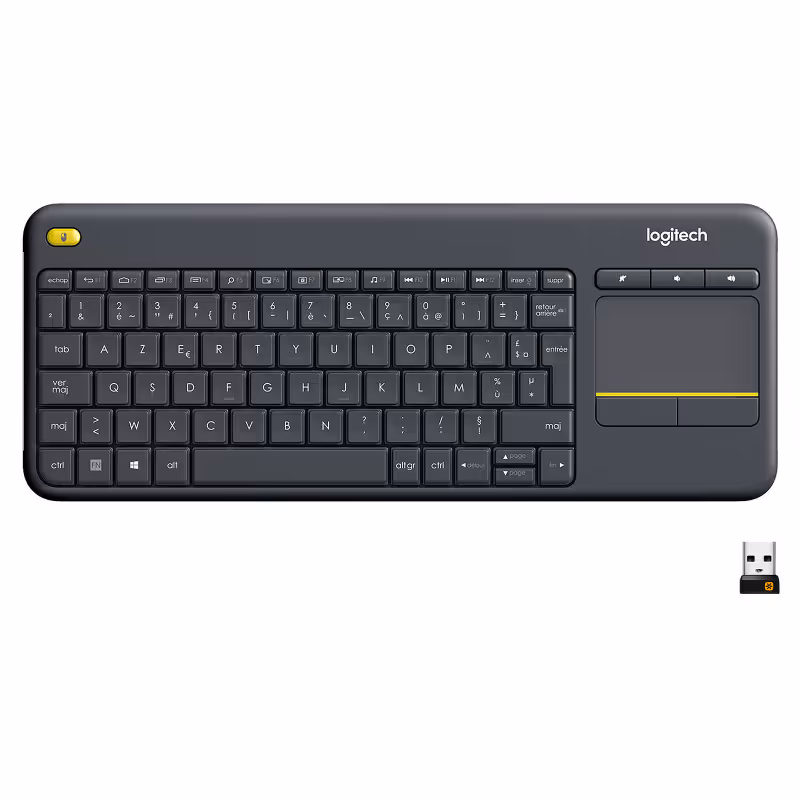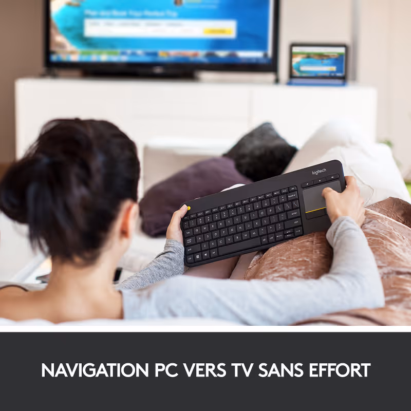 Le Logitech K400 Plus est un clavier sans fil AZERTY conçu pour offrir une expérience de navigation fluide et confortable, que ce soit sur un PC, un téléviseur connecté ou un appareil Android. Idéal pour le salon, il intègre un pavé tactile multitouch qui remplace efficacement la souris, vous permettant de contrôler votre appareil d’un seul geste, depuis votre canapé. Grâce à sa connexion sans fil via le protocole Logitech Unifying (2,4 GHz), ce clavier assure une portée fiable allant jusqu’à 10 mètres, sans interruption ni latence. Il est alimenté par 2 piles AA, offrant une excellente autonomie, et son design compact et léger facilite son utilisation au quotidien.