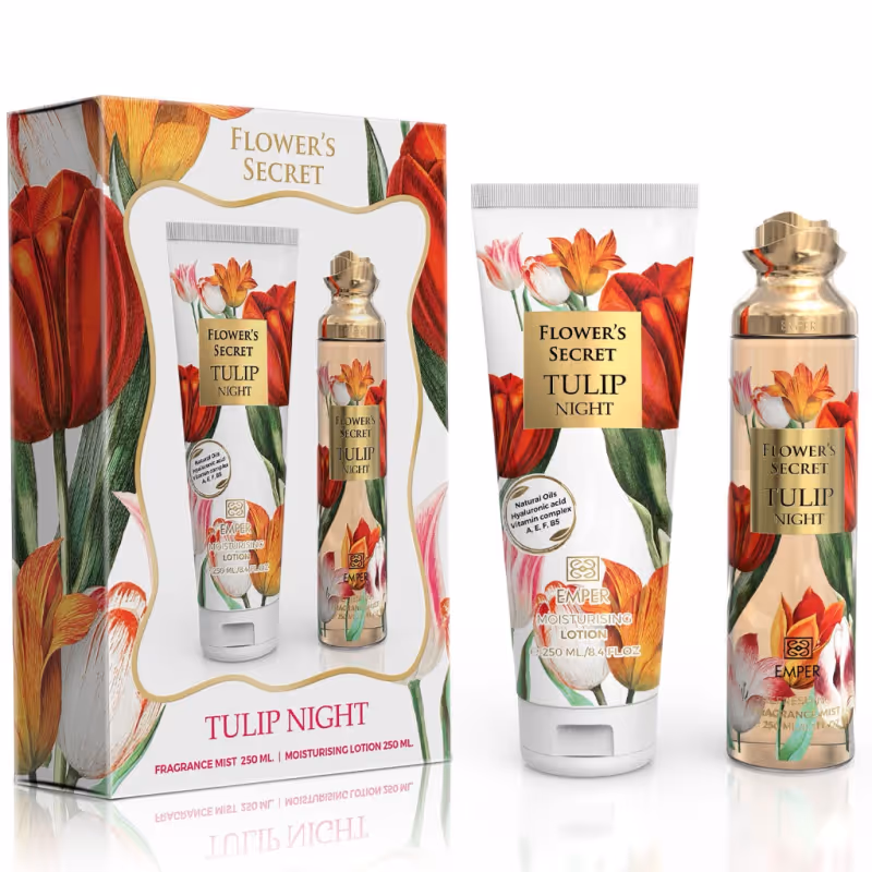 Flower's Secret Tulip Night est un coffret féminin combinant Brume de Corps 250 ml et Lait de Corps 250 ml, offrant une expérience parfumée fraîche, fruitée et florale. Il s’ouvre sur des notes fruitées de mangue, pamplemousse, fraise des bois et pomme, évolue vers un cœur délicat de freesia, fleur de tilleul et muguet, et repose sur un fond chaleureux et sensuel de ambre, vanille et musc.