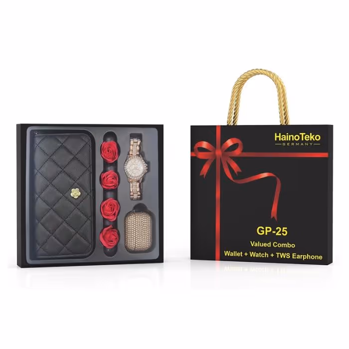 Le coffret Haino Teko est un ensemble élégant et pratique comprenant trois produits de qualité : une montre GP-25, un portefeuille pour femme raffiné et des AirPods. Parfait pour ceux qui cherchent à offrir un cadeau alliant luxe, style et fonctionnalité.