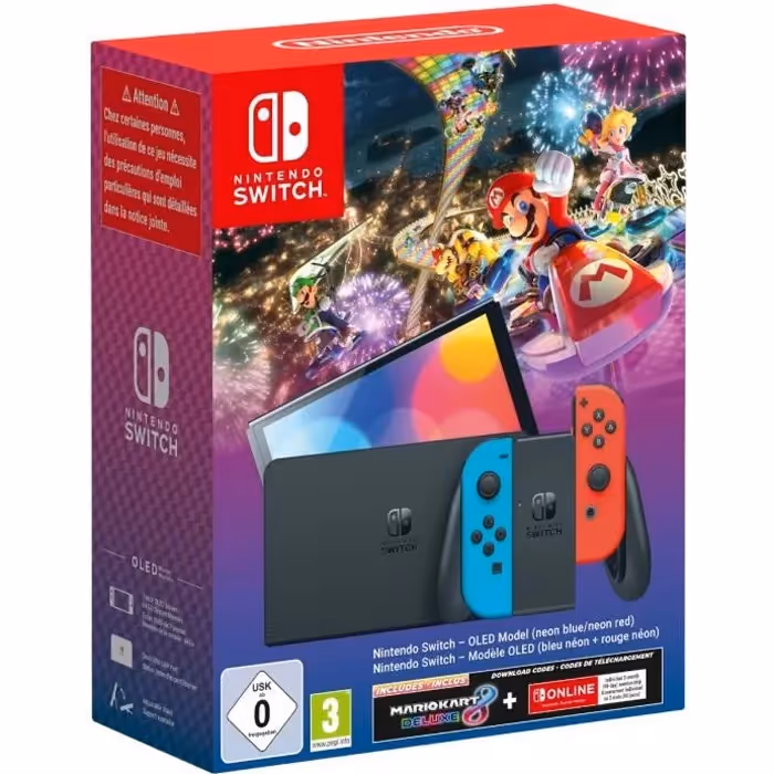 | Nom du produit | Console Nintendo Switch - Modèle OLED • Bleu Néon & Rouge Néon + Mario Kart 8 Deluxe (Code) + 3 mois d'abonnement NSO (Code) |