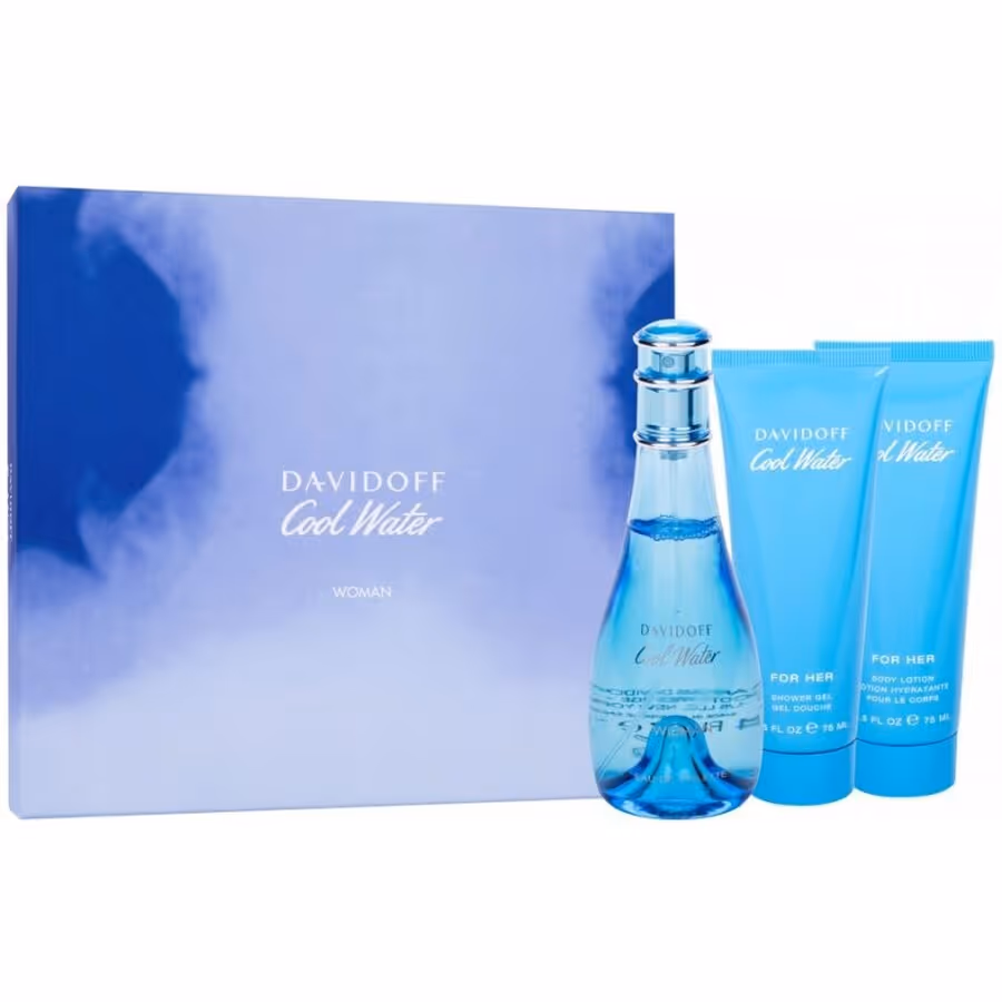 Coffret Davidoff Cool Water Femme – Eau de Toilette 100 ml + Gel Douche 75 ml + Lait Corporel 75 ml Une expérience olfactive rafraîchissante et envoûtante. La fragrance emblématique s’ouvre sur des notes fruitées et florales de melon, lotus, citron, ananas et lys, évoluant vers un cœur somptueux de jasmin, muguet et rose, avant de se fondre dans des notes chaudes de musc, vétiver, santal et vanille. Ce coffret permet de superposer les produits pour un parfum plus intense et durable, parfait pour offrir ou se faire plaisir avec élégance et sophistication.