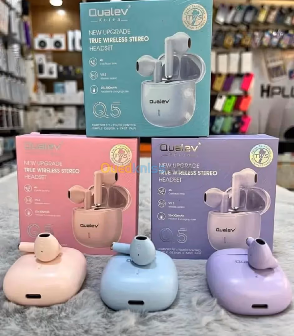 Les Écouteurs Sans Fil Qualev Korea Q5 combinent confort, performance audio de qualité, autonomie et fonctionnalités modernes dans un design élégant. Que ce soit pour écouter de la musique, passer des appels ou faire du sport, ces écouteurs sans fil offrent une expérience audio optimale et une grande flexibilité.
