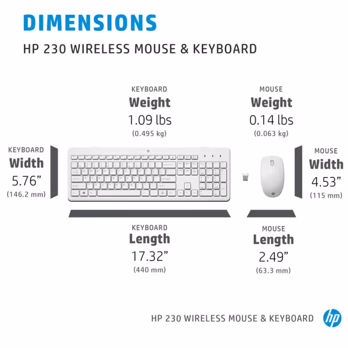 Ensemble Clavier Souris sans fil HP - Azerty - Récepteur USB sans fil - Résolution 1600 DPI - 3 Boutons - Dimensions: Clavier 440 x 146.2 x 27.6 mm, Souris: 63.3 x 115 x 36.2 mm - Compatible avec Windows 7/8/10 - Couleur Blanc - Garantie 1 an