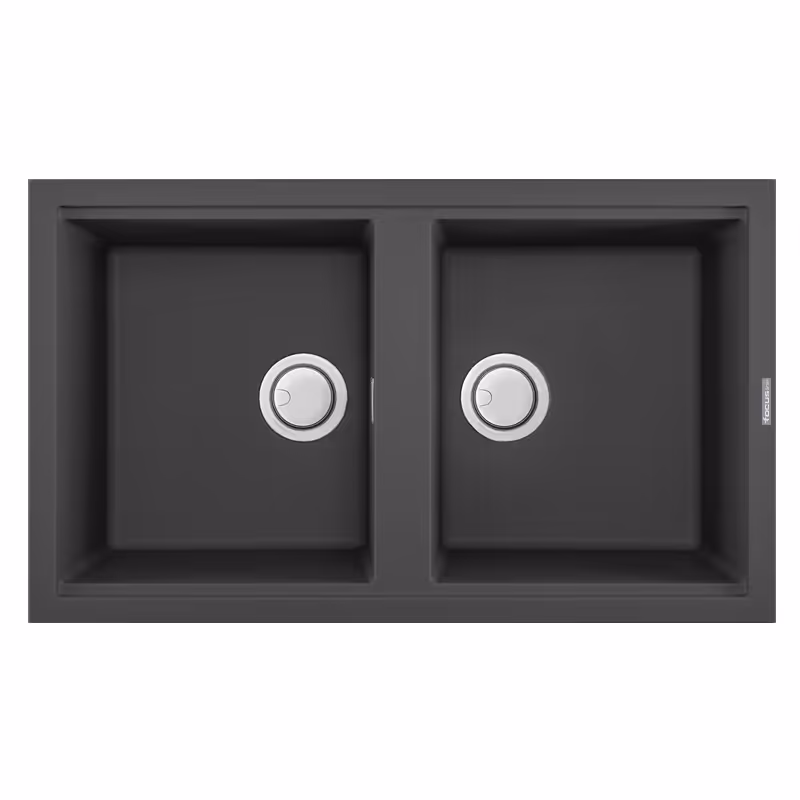 Évier de cuisine encastrable FOCUS à 2 bacs réversibles, adapté aux installations standard. Dimensions 860 × 510 mm, encastrement 840 × 480 mm, compatible avec un meuble de base de 90 cm. Profondeur des deux bacs 20 cm. Finition élégante, alliant praticité et design moderne.