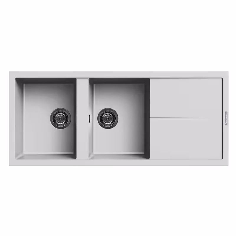 Évier de cuisine encastrable FOCUS à 2 bacs avec égouttoir, réversible et compatible avec une installation standard. Égouttoir positionné à droite. Dimensions 116 × 50 cm avec encastrement 114 × 48 cm, adapté aux bases de 80 cm. Profondeur des deux bacs : 20 cm. Finition élégante couleur Blanc.