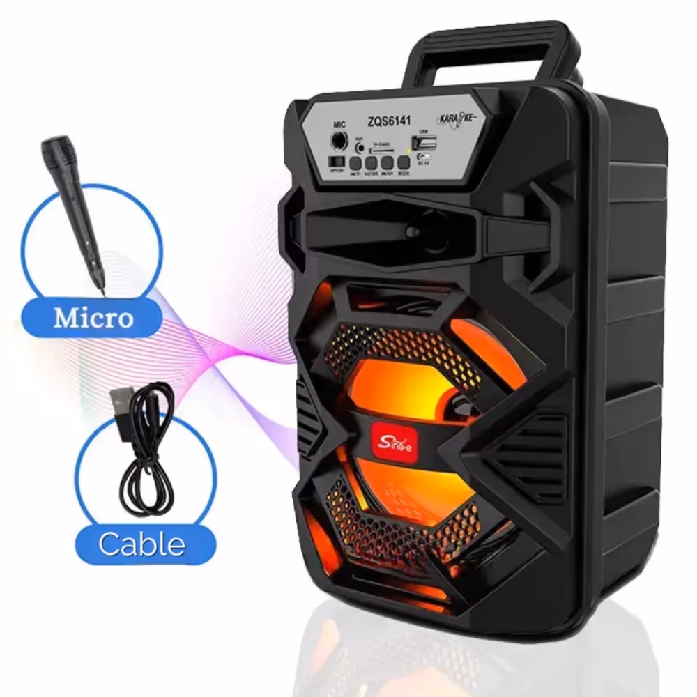 Haut-parleur sans fil ZQS 6141 rechargeable avec microphone - Noir est un appareil pratique et performant, idéal pour profiter de votre musique en toute liberté. Grâce à sa connectivité Bluetooth, il assure une transmission stable jusqu’à 10 mètres de portée. Avec une puissance de 15 Watts, il délivre un son clair et équilibré, adapté aux usages quotidiens ou aux petites soirées. Il dispose de plusieurs interfaces comme USB, TF et AUX, offrant une grande flexibilité de lecture. Sa batterie de 1500 mAh garantit une autonomie de 5 à 6 heures, tandis que le microphone inclus le rend parfait pour le karaoké ou les appels. Compact et élégant en couleur noire, ce modèle est couvert par une garantie de 6 mois.