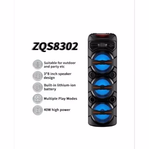 Haut-parleur sans fil ZQS 8302 rechargeable avec microphone - Noir est une enceinte puissante conçue pour offrir une expérience sonore immersive et dynamique. Doté d’une puissance de 60W (20W x3) et de 3 haut-parleurs de 8 pouces, il délivre un son profond avec une réponse en fréquence de 45Hz à 18KHz. Sa connectivité Bluetooth 5.0, ainsi que ses ports USB, AUX et carte mémoire, assurent une grande flexibilité d’utilisation. Équipé d’une batterie de 4500 mAh, il offre une autonomie de 3 à 4 heures, idéale pour les événements et les fêtes. Ce modèle inclut également un microphone et une télécommande, tout en proposant un design robuste avec un poids de 7 kg et des dimensions de 312 x 312 x 944 mm. Sa finition en couleur noire et sa garantie de 1 an en font un choix fiable pour une utilisation intensive.