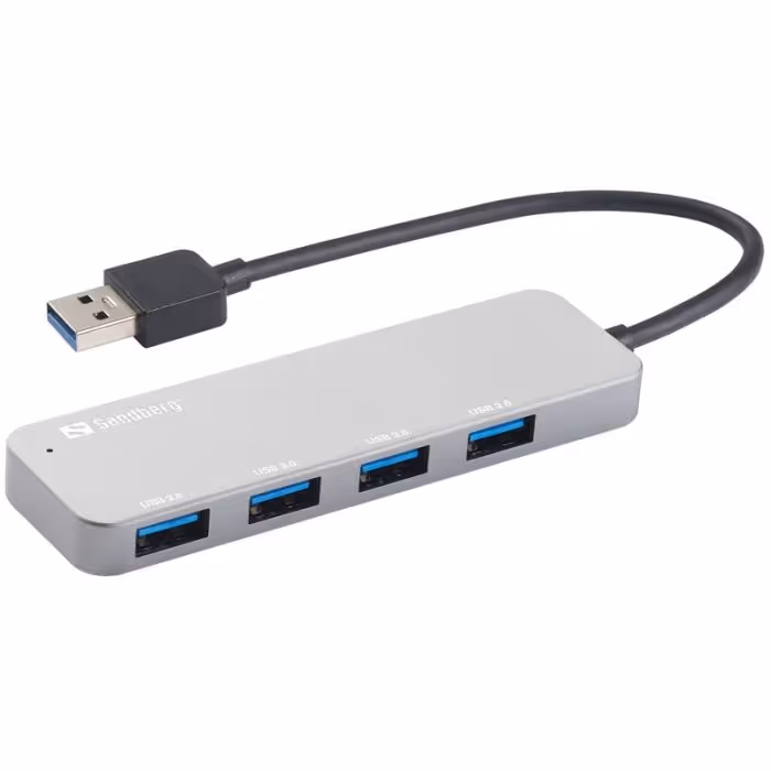 Hub USB SANDBERG - Interface standard: USB 3.0 ,USB 3.0, USB 2.0 et USB 1.1 conforme - Vitesse: Supports SuperSpeed (5 Gbit/sec), haute vitesse (480 Mbit/s), pleine vitesse (12 Mbit/s) - Connecteurs USB 3.0: 4 x USB 3.0 A-female, 1 x USB 3.0 A-male - Boîtier en aluminium - Couleur: Silver - Garantie: 1an