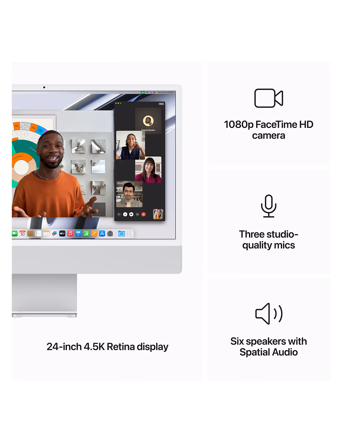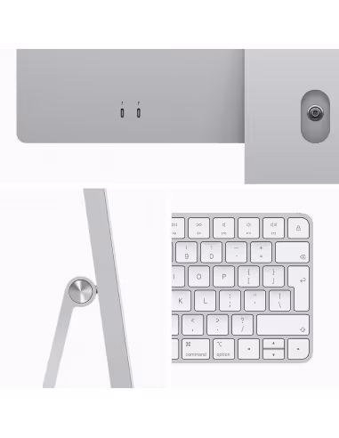 Le design tout-en-un de l'iMac 24" est non seulement élégant mais aussi pratique. Son profil fin et son châssis compact permettent de gagner de l'espace tout en offrant un large écran. La couleur Silver apporte une touche moderne et rafraîchissante, idéale pour un environnement de travail créatif ou personnel. Ce modèle intègre également une webcam 1080p pour des visioconférences nettes et claires.