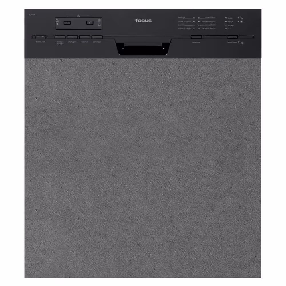 Lave-Vaisselle Focus F500B – 12 couverts, Noir - Lave-vaisselle semi-encastrable compact et performant, idéal pour les cuisines modernes. Il accueille jusqu’à 12 couverts et propose 4 programmes et 4 températures pour un lavage adapté à chaque vaisselle. Économique et silencieux avec une consommation de 12 L et un niveau sonore de 57 dB(A). Équipé de fonctions pratiques comme le départ différé (3-6-9-12 h), le verrouillage enfant et la visualisation du déroulement du programme. Classe énergétique A++, réglable facilement grâce à ses pieds. Dimensions : 82 x 60 x 57 cm. Garantie 2 ans.