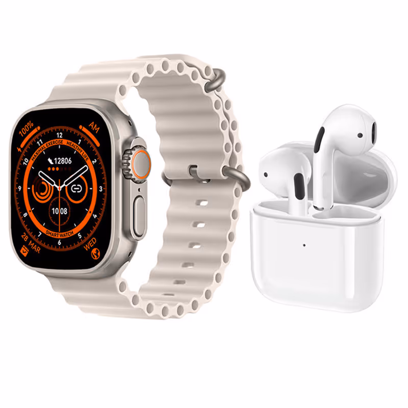 La Montre Connectée T55 Ultra Max + 2 Ceintures + Earbuds - BLANC est un ensemble complet d'accessoires technologiques haut de gamme. Elle inclut :