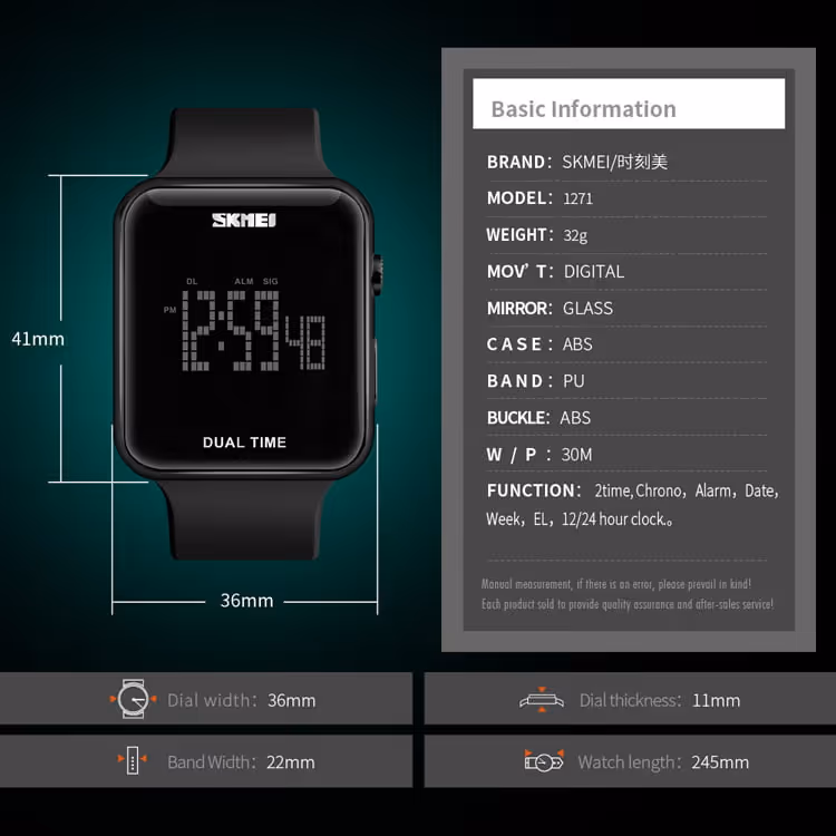 La Skmei SK-1271 est une montre digitale sportive conçue pour les hommes, alliant simplicité, confort et robustesse. Idéale pour un usage quotidien comme pour les activités sportives.