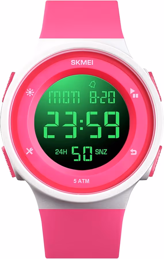 Montre Skmei Digitale Sport SK-1445 pour Femme - Rose allie élégance et performance. Légère (41 g) et résistante, elle offre une étanchéité jusqu’à 50 mètres et de multiples fonctions pratiques : double fuseau horaire, chronographe, alarme, date, jour de la semaine, éclairage EL et affichage 12/24 heures. Idéale pour un usage sportif ou quotidien.