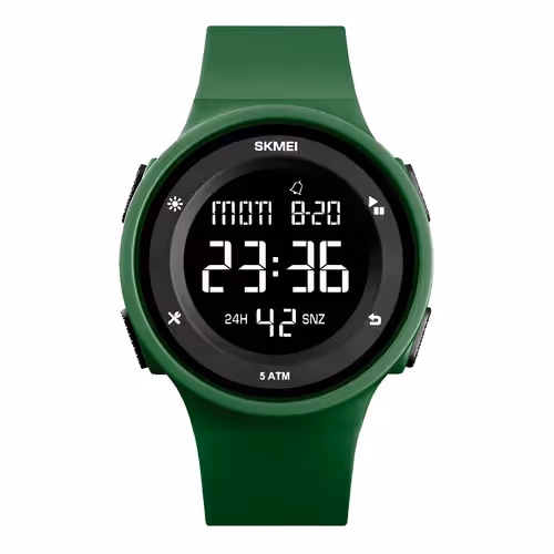 Montre Skmei Digitale Sport SK-1445 pour Femme - Vert allie élégance et performance. Légère (41 g) et résistante, elle offre une étanchéité jusqu’à 50 mètres et de multiples fonctions pratiques : double fuseau horaire, chronographe, alarme, date, jour de la semaine, éclairage EL et affichage 12/24 heures. Idéale pour un usage sportif ou quotidien.