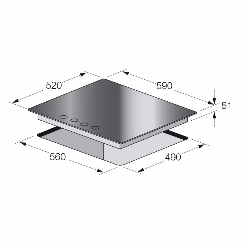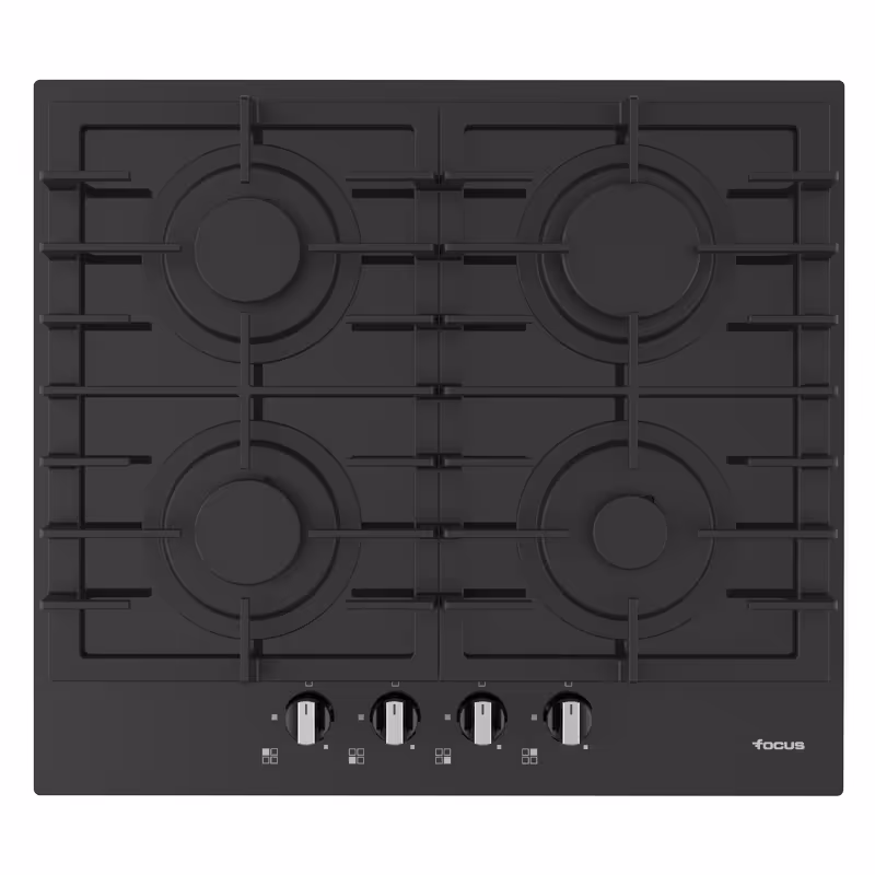 Plaque à gaz 4 foyers de 60 cm avec grilles et chapeaux de brûleurs en fonte, allumage automatique et commandes frontales. Surface vitro noir avec flamme stabilisée pour une cuisson sûre et homogène. Dimensions : 590 x 520 x 51 mm. Garantie 2 ans.