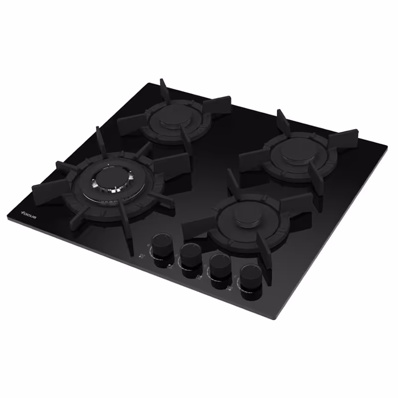 Plaque à gaz 4 foyers de 60 cm, dont un triple couronnes, avec grilles et chapeaux de brûleurs en fonte. Allumage automatique, commandes frontales et surface Vitrocrystal noire. Flamme stabilisée pour une cuisson homogène. Dimensions : 520 x 590 x 51 mm. Garantie 2 ans.