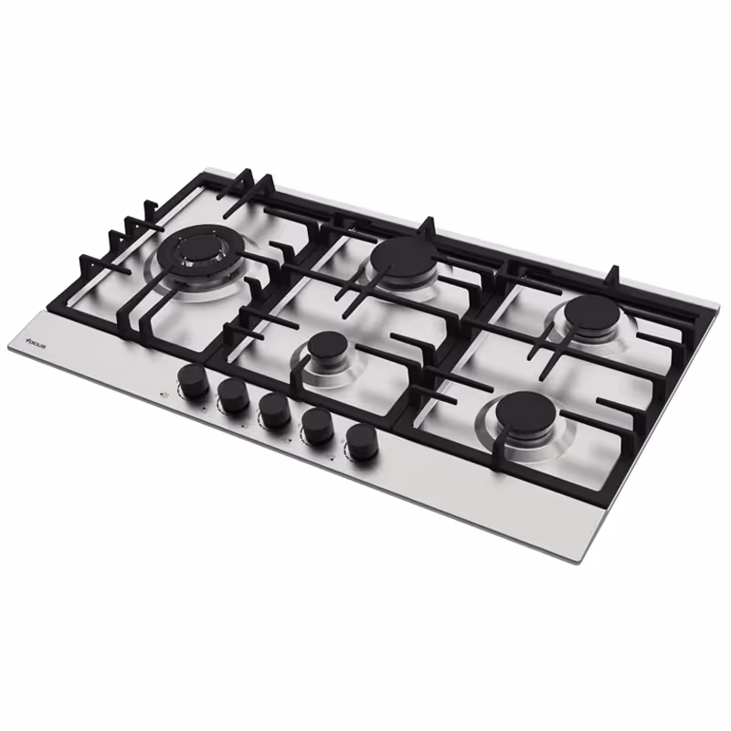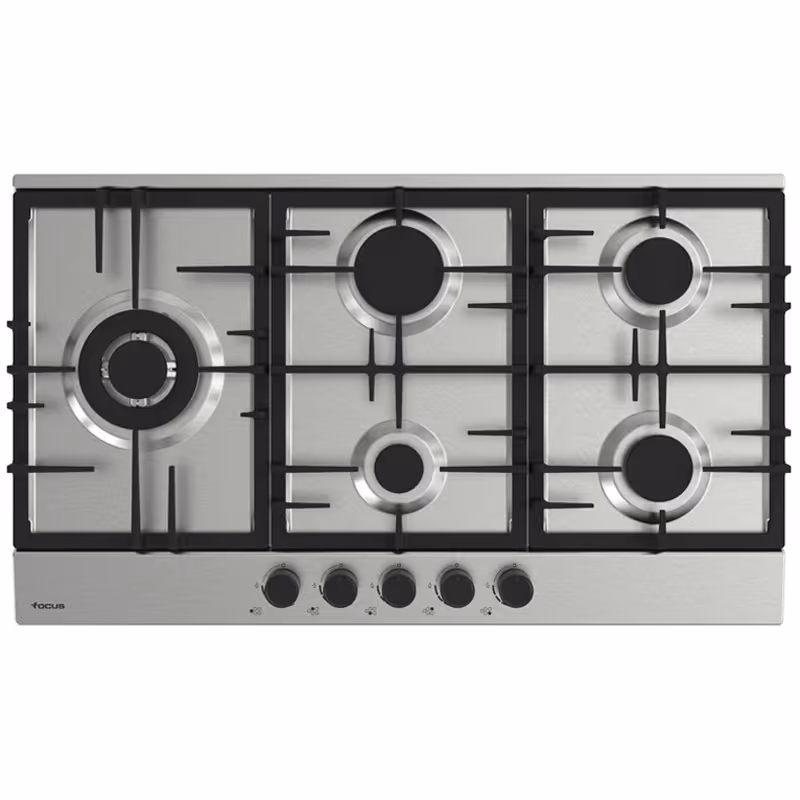 Plaque de cuisson encastrable FOCUS à gaz, largeur 90 cm, dotée de 5 feux dont 1 foyer triple couronnes pour une puissance de cuisson optimale. Elle est équipée de grilles et chapeaux de brûleurs en fonte, d’une flamme stabilisée, de commandes frontales pratiques et d’un allumage automatique. Couleur : Inox – Garantie : 2 ans.