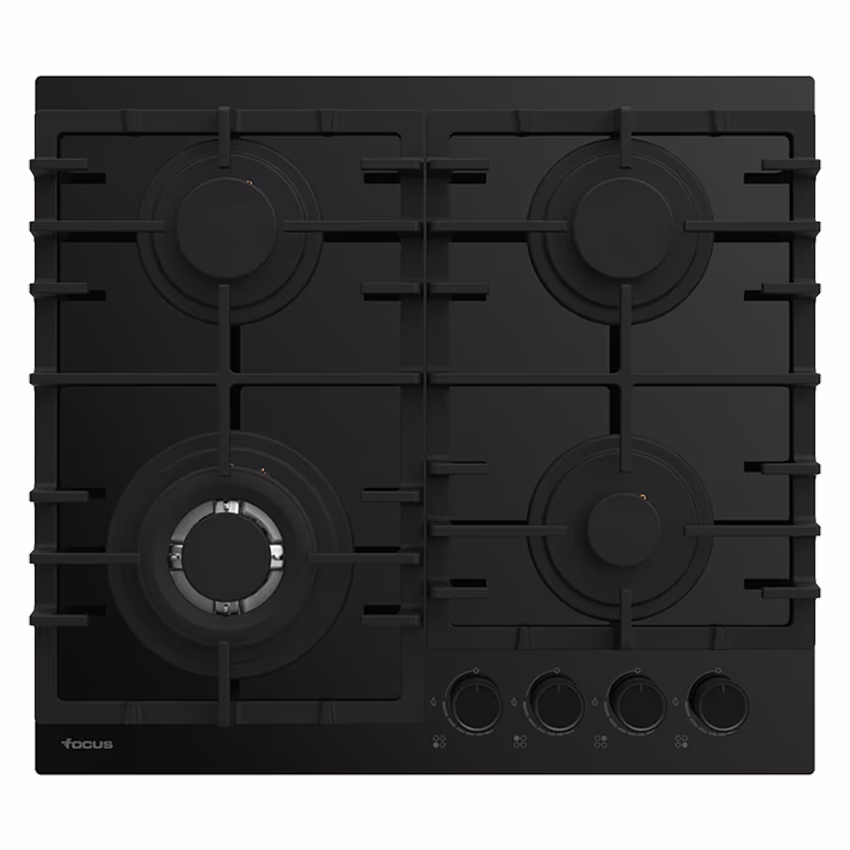 Plaque de cuisson encastrable FOCUS, modèle gaz noir de 60 cm avec 4 feux (dont un double couronne) offrant une flamme stabilisée pour une cuisson précise. Équipée d’un allumage automatique, de grilles et chapeaux de brûleurs en fonte robustes et d’une sécurité thermocouple sur chaque brûleur pour un usage sûr et fiable. Design élégant noir, idéal pour cuisines modernes.