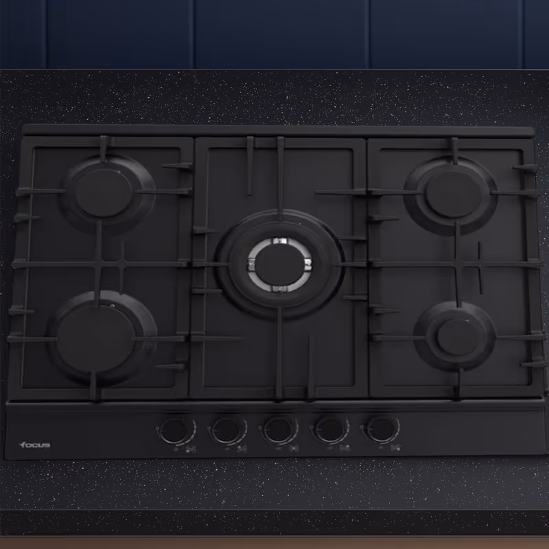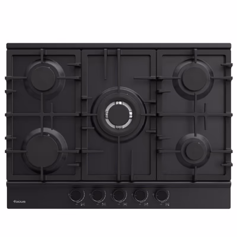 Plaque de cuisson encastrable FOCUS : modèle à gaz de 70 cm avec 5 foyers, dont un brûleur triple couronne pour une forte puissance. Équipée de grilles et chapeaux en fonte, flamme stabilisée, sécurité gaz avec thermocouple sur chaque brûleur, allumage automatique et commandes frontales. Finition noir élégante, garantie 2 ans.