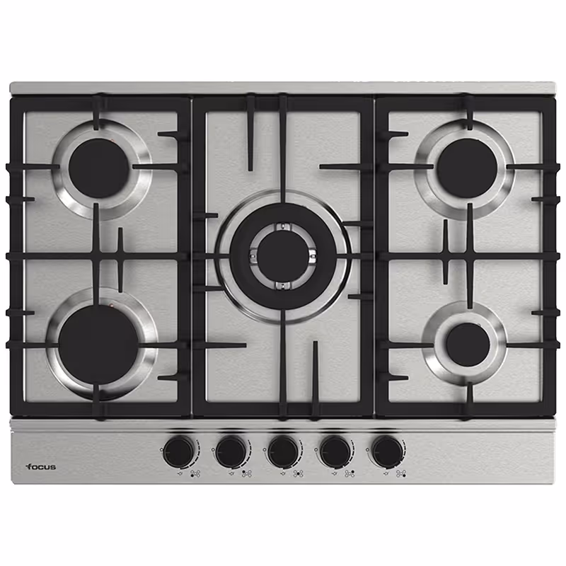 Plaque de cuisson encastrable FOCUS, modèle à gaz de 70 cm avec 5 foyers, dont un brûleur triple couronne pour une puissance optimale. Équipée de grilles et chapeaux de brûleurs en fonte, flamme stabilisée, sécurité thermocouple sur chaque brûleur, allumage automatique et commandes frontales. Finition inox élégante, dimensions 51 × 510 × 690 mm, garantie 2 ans.