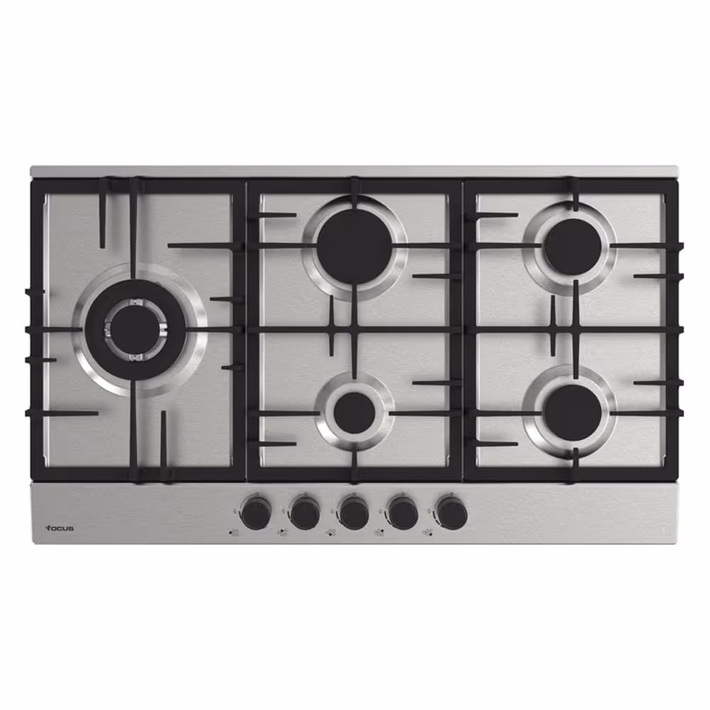 Plaque de cuisson encastrable FOCUS F8017XS : modèle à gaz 90 cm avec 5 foyers, dont un brûleur triple couronne pour une cuisson puissante. Équipée de grilles et chapeaux en fonte, flamme stabilisée, sécurité thermocouple sur chaque brûleur, allumage automatique et commandes frontales. Finition inox élégante.