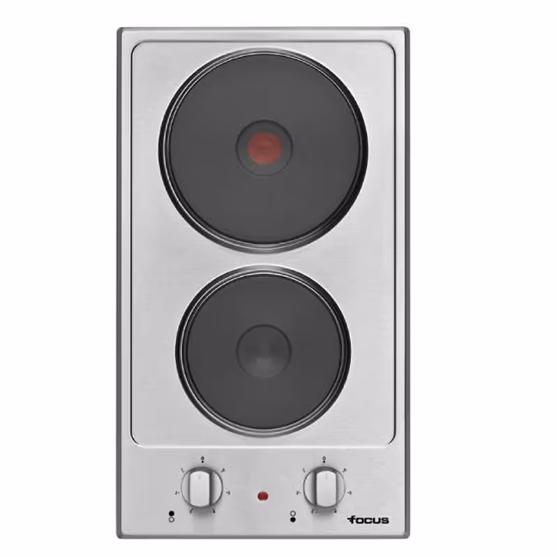 Plaque de cuisson encastrable FOCUS électrique, largeur 30 cm, équipée de 2 feux. Elle dispose de commandes frontales, d’un allumage automatique et d’une finition inox élégante.