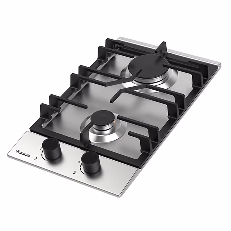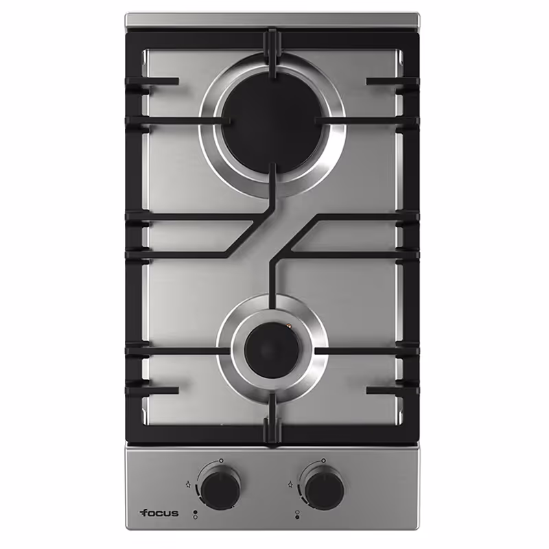 Plaque de cuisson encastrable FOCUS QUADRA 32 Plaque à gaz compacte, largeur 30 cm, équipée de 2 brûleurs avec thermocouple pour plus de sécurité. Elle dispose de grilles et chapeaux de brûleurs en fonte, d’un allumage automatique et d’une sécurité gaz sur chaque brûleur. Finition inox élégante.