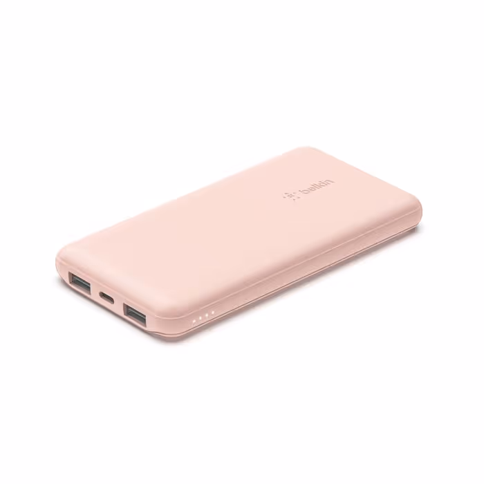 Le Power Bank Belkin 3Ports 10K - Rose est une batterie externe de haute capacité, conçue pour offrir une solution de recharge pratique et rapide lors de vos déplacements. Avec une capacité de 10 000 mAh, il peut recharger vos appareils plusieurs fois, tout en permettant de le faire simultanément grâce à ses trois ports de charge.