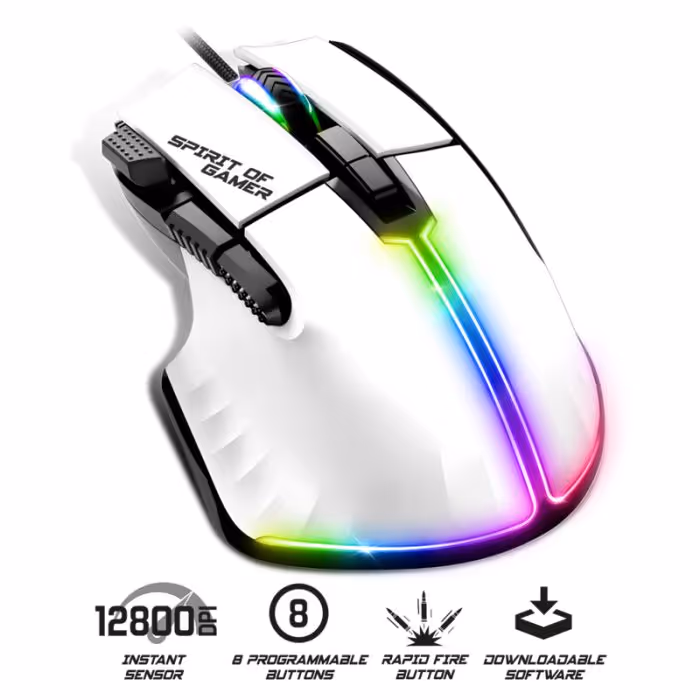 La Souris Gaming Filaire Spirit Of Gamer Pro-M5 RGB - Blanc est l'outil idéal pour améliorer votre performance dans les jeux tout en apportant une touche de style à votre installation.