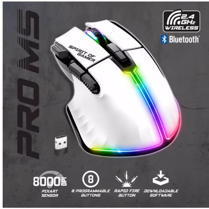 La Pro-M5 RGB de Spirit Of Gamer est une souris complète, alliant technologie sans fil, précision et esthétique gaming. Que vous soyez un joueur compétitif ou un utilisateur avancé, elle saura répondre à toutes vos attentes.