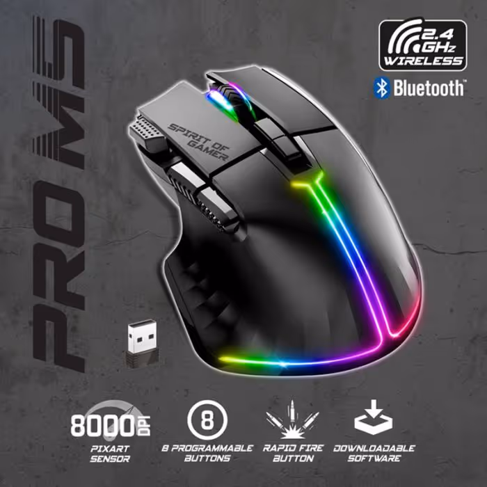 La Pro-M5 RGB de Spirit Of Gamer est une souris complète, alliant technologie sans fil, précision et esthétique gaming. Que vous soyez un joueur compétitif ou un utilisateur avancé, elle saura répondre à toutes vos attentes.