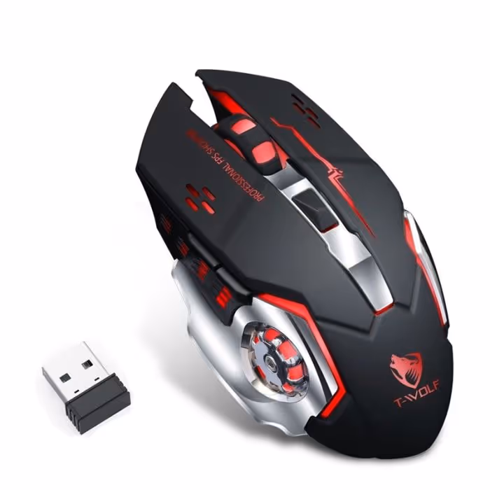 Souris Gamer T-WOLF Q13 - Technologie de connectivité: Sans Fil(Bluetooth ) - Résolution: 2400 dpi - Batterie rechargeable de 600 mAh - Nombre de boutons: 4 programmables - Éclairage Arc-en-ciel LED - Distance de fonctionnement: 10 mètres - Couleur: Noir - Garantie: 1 an.
