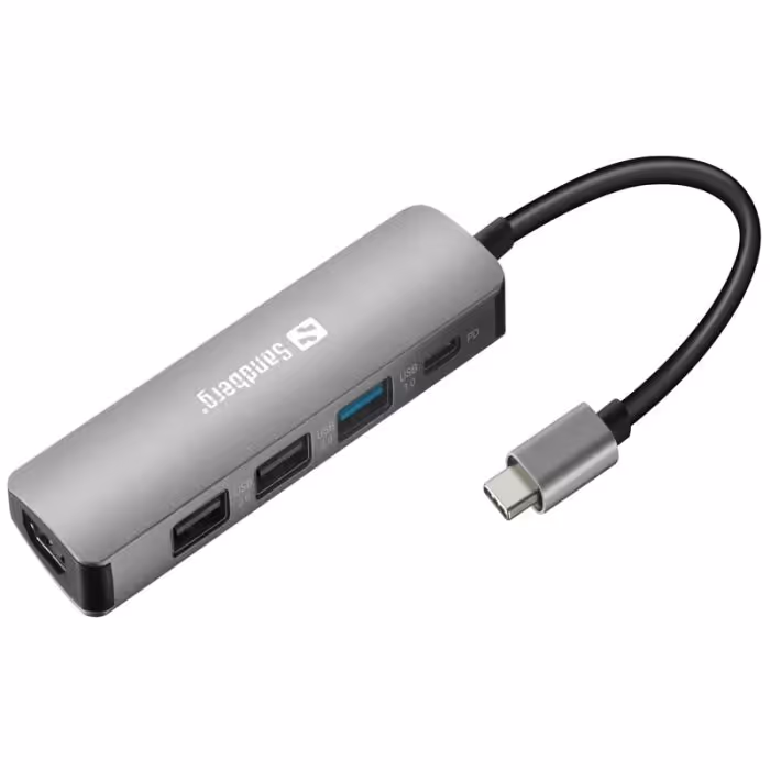 Station d'accueil SANDBERG Dock - Entrée: USB-C mâle - Sorties: HDMI femelle, USB-C femelle (pour une alimentation prenant en charge jusqu'à 100 W), 1 x USB 3.0 A femelle, 2 x USB 2.0 femelle - Prend en charge le format d'image grand écran du streaming vidéo Full HD 4K 16:9 - Prend en charge le miroir d'affichage de bureau, le mode extension, le mode multi-écran et le mode rotation de l'écran - Le moteur graphique USB hautes performances prend en charge la résolution 4K/30 Hz - Reconnaissance automatique du type de moniteur, de la résolution et des fonctionnalités - Boîtier en aluminium - Garantie: 1 an