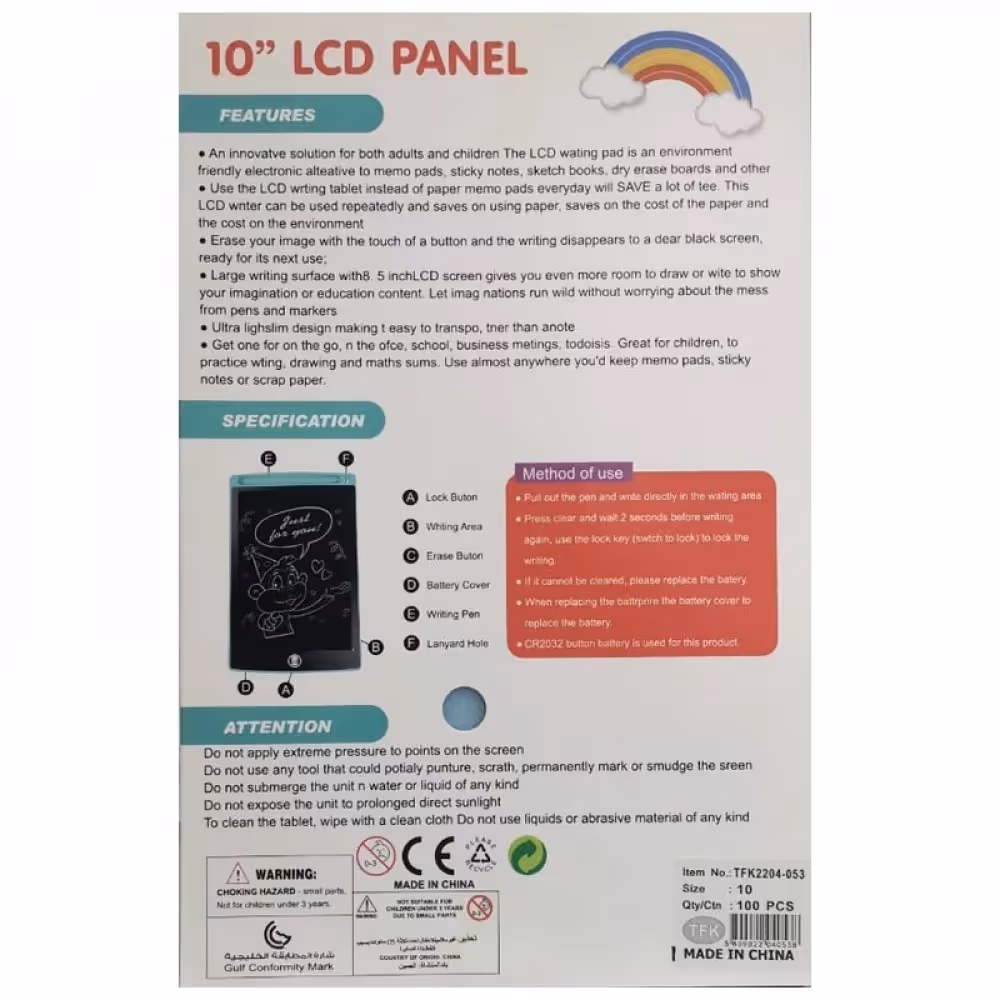 La tablette d’écriture colorée à écran LCD 10 pouces est un outil innovant conçu pour offrir une expérience d'écriture fluide et agréable. Son écran LCD haute sensibilité permet de dessiner ou d’écrire en couleur, sans encre ni papier, en simulant parfaitement l'effet du stylo sur le papier. Elle convient aussi bien aux enfants qu'aux adultes pour diverses utilisations : dessin, apprentissage, prise de notes, liste de tâches ou encore mémo rapide.