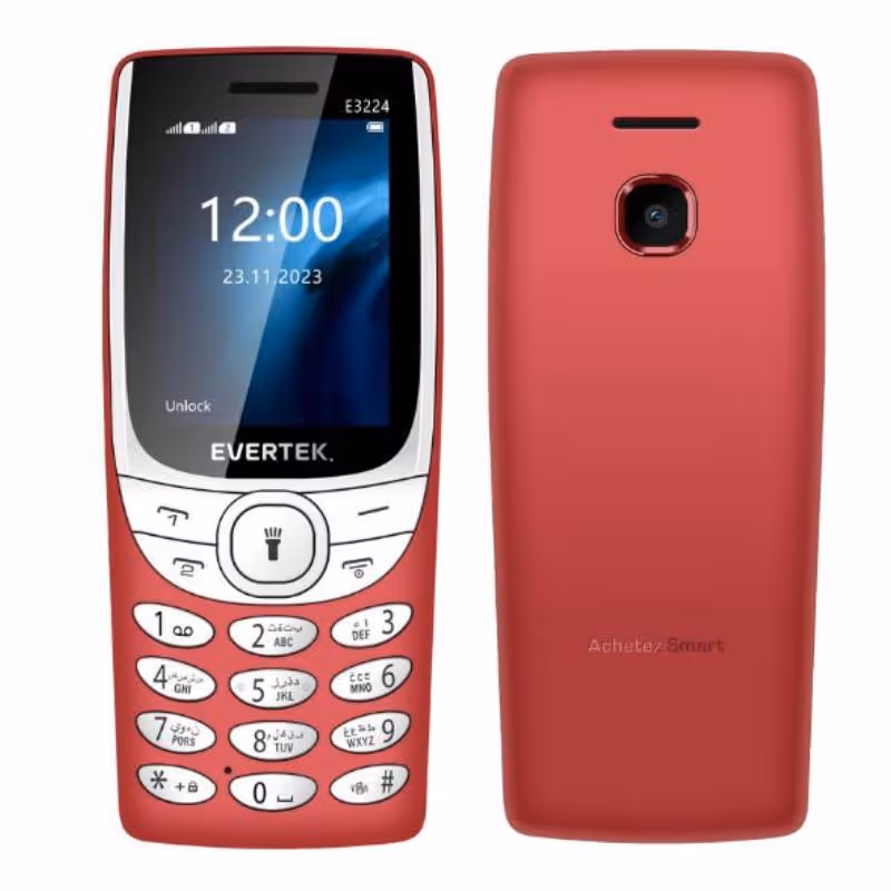 Écran: 2.4" QVGA clair et lisible - Résolution: 240 x 320 pixels - Capacité batterie: 1800 mAh - Stockage extensible via carte microSD (jusqu'à 16 Go) - Appareil Photo: 0.08 MP - Lampe torche - Mp3, Mp4 player - Radio FM (sans fil) - Connecteurs: Port USB-C | Port Jack 3.5 mm - Dual SIM - Compact et léger - Couleur: Rouge - Garantie: 1 an
