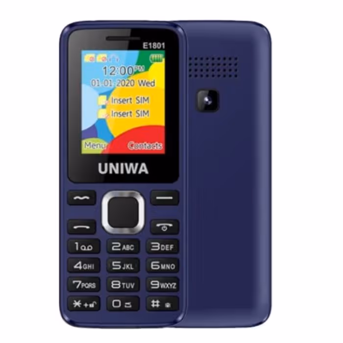 Téléphone UNIWA E1801 - Ecran 1.77" (160 x 128 pixels) QQVGA - Processeur: SC6531E -Mémoire vive: 32Mo - Stockage: 32 Mo extensible avec carte micro-SD jusqu’à 32G - Caméra Arrière : 0,08MP - Batterie : 800 mAh - Double SIM -Bluetooth-Radio FM ,lecteur MP3/MP4 -lampe torche - Haut-parleur puissant - Longue veille - Dimensions: 108 x 45,2 x 13,9 millimètres - Poids: 68g - Garantie : 1 an