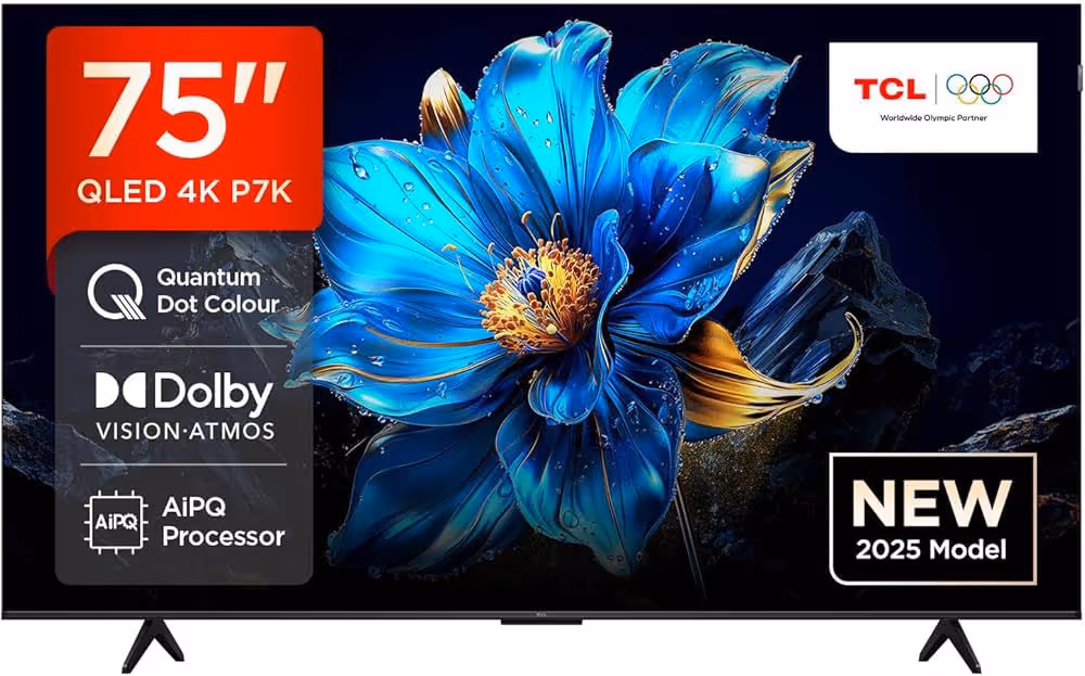 Tv TCL 75" Smart P7K 4K UHD - Résolution: 3840 x 2160 pixels - Miracast et Google TV - Format d’image: 16:09 - Taux de rafraîchissement: 60Hz IA Clarity | 120Hz en Full HD - Dolby Vision -Dolby Atmos - HLG - HDR 10 - Cristal quantique coloré (Plus d'un milliard de teintes de couleurs) - MEMC: réduit les flous d'affichage de mouvement - Puissance sonore: 2x15W - Google Assistant, Alexa - Connectivité: Wi-Fi 2.4G/5G, Bluetooth 5.4 - Design Slim Ui-body - Connecteurs: 3 x HDMI | 2 x USB-A | 1 x Ethernet (LAN) - Dimensions avec support: 1666x1035x347 mm - Poids avec support: 23.2 kg - Couleur: Noir - Garantie: 2 ans.