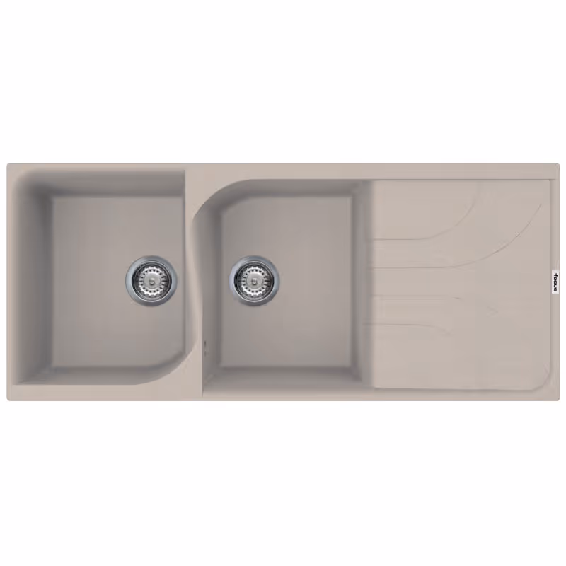 Évier de cuisine encastrable FOCUS à 2 bacs avec égouttoir, réversible pour une installation standard. Égouttoir positionné à droite. Dimensions 116 × 50 cm avec encastrement 114 × 48,5 cm, adapté aux bases de 80 cm. Profondeur des deux bacs : 21 cm. Finition élégante couleur Avena.