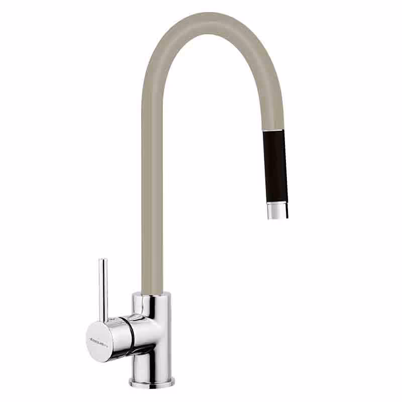Mitigeur grège avec douchette escamotée, corps au design marquant, levier long et ergonomique, et col haut pour faciliter le remplissage de grands récipients.