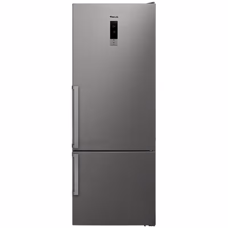 Réfrigérateur combiné 2 portes FOCUS avec refroidissement No-Frost et afficheur digital. Il offre une grande capacité de 483 L net dans un design inox moderne. Économe (classe A++) et silencieux (44 dB(A)), il est équipé d’un éclairage LED, de clayettes en verre, d’une alarme porte ouverte et d’une sécurité enfant. Adapté à différentes températures ambiantes (classe climatique T/SN). Dimensions : 700 × 712 × 1860 mm. Garantie 2 ans.